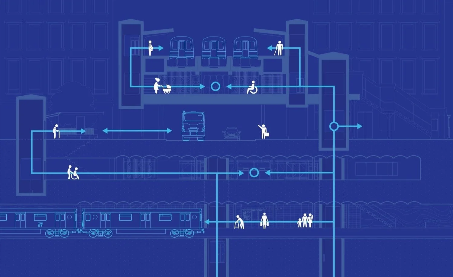 A proposal cover showing all NJ Transit commuter lines terminating in Hoboken. I took the vector paths and placed them over a colorized satellite map, and used their charming corresponding icons in a decorative banner at the top.