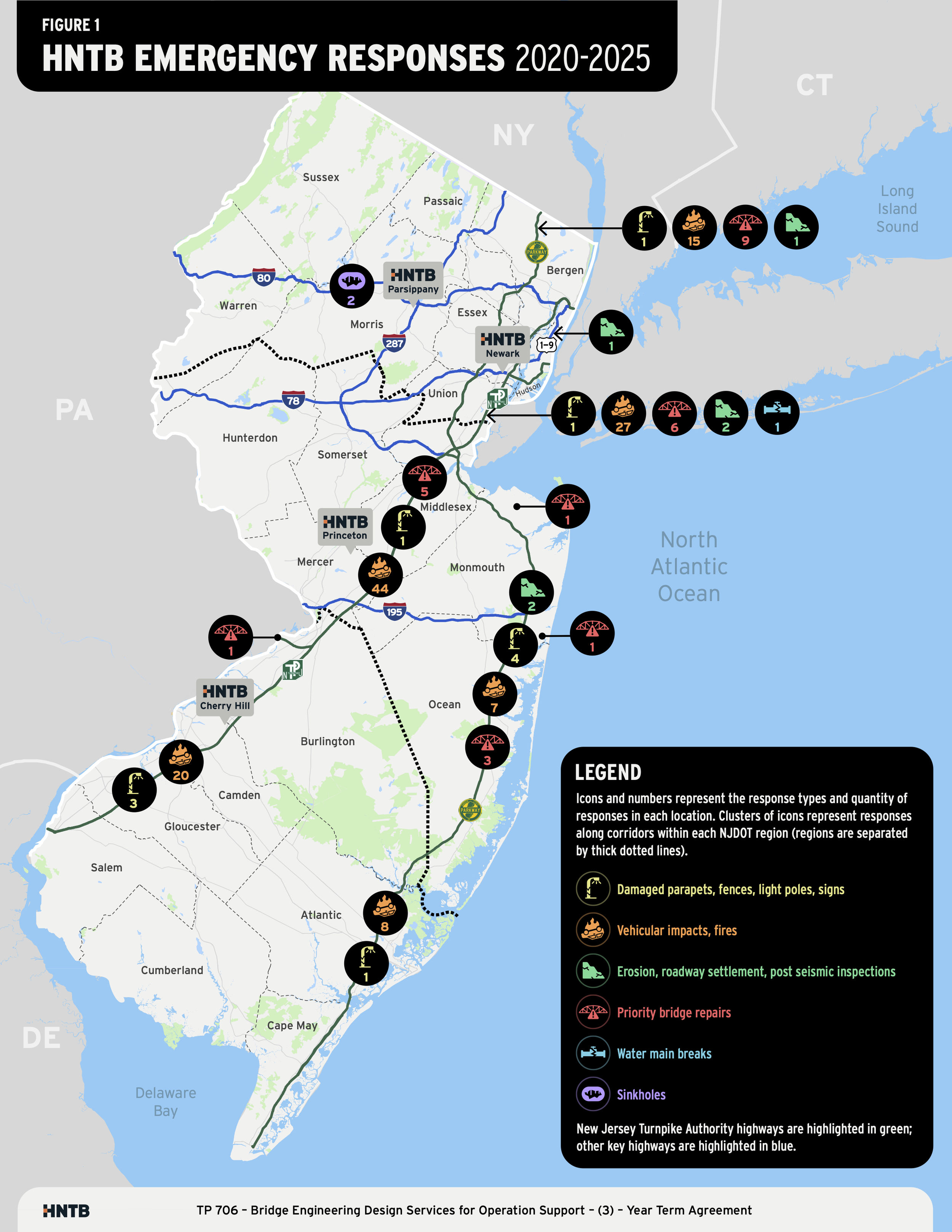 A full-page map graphic showing the team’s experience responding to various highway emergencies. Starting with only a spreadsheet documenting these incidents, I built the map using layers from ArcGIS, then used customized icons to group incidents into easily understandable clusters.